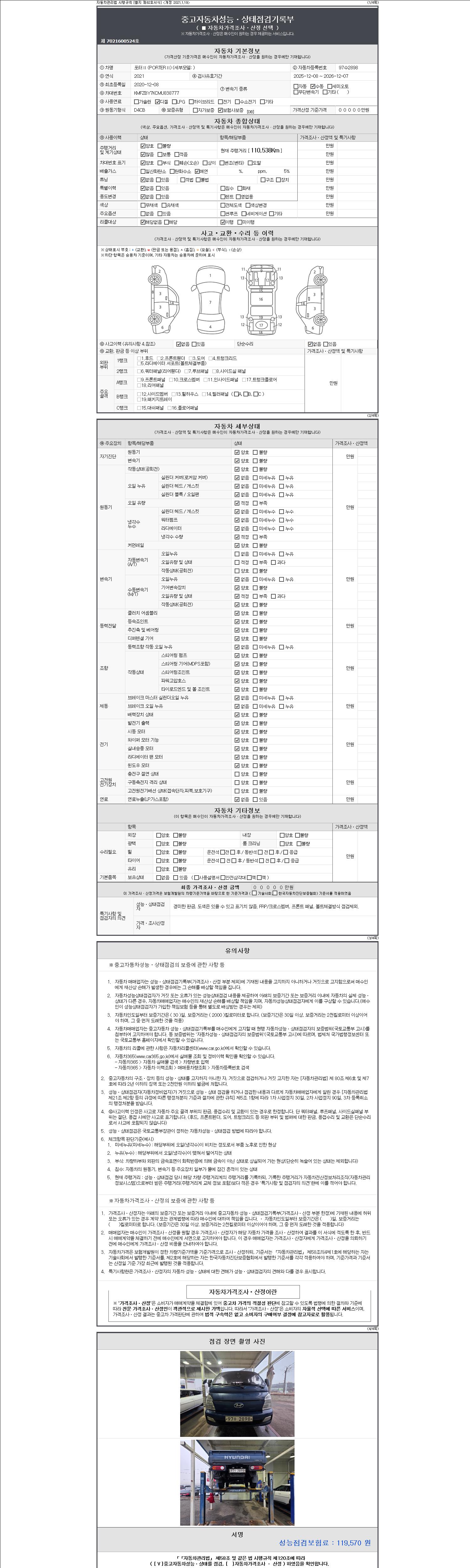자동차관리법 시행규칙 제120조의 규정에 따라 별지 제 82호서식 《중고자동차 성능, 상태점검 기록부》를 발행한 성능, 상태점검자 및 매매자는 아래의 보증기간 또는 보증거리 이내의 중고자동차, 성능점검 기록부에 기재된 내용과 자동차의 실제 성능, 상태가 다른 경우 계약 또는 관계법령에 따라 매수인에 대하여 책임을 집니다.