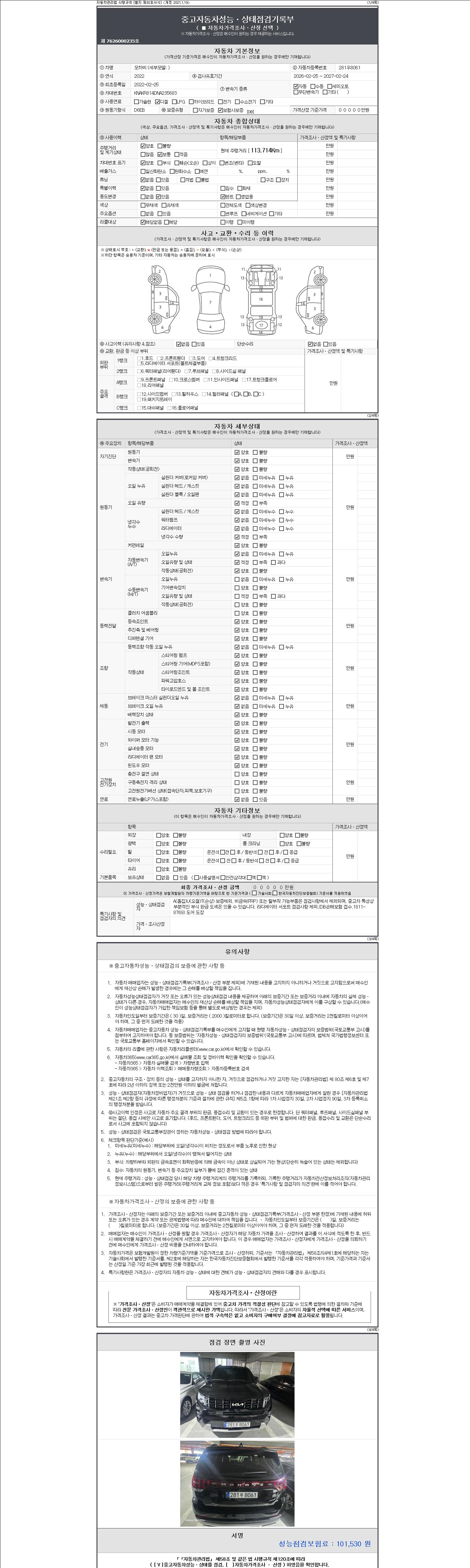 자동차관리법 시행규칙 제120조의 규정에 따라 별지 제 82호서식 《중고자동차 성능, 상태점검 기록부》를 발행한 성능, 상태점검자 및 매매자는 아래의 보증기간 또는 보증거리 이내의 중고자동차, 성능점검 기록부에 기재된 내용과 자동차의 실제 성능, 상태가 다른 경우 계약 또는 관계법령에 따라 매수인에 대하여 책임을 집니다.