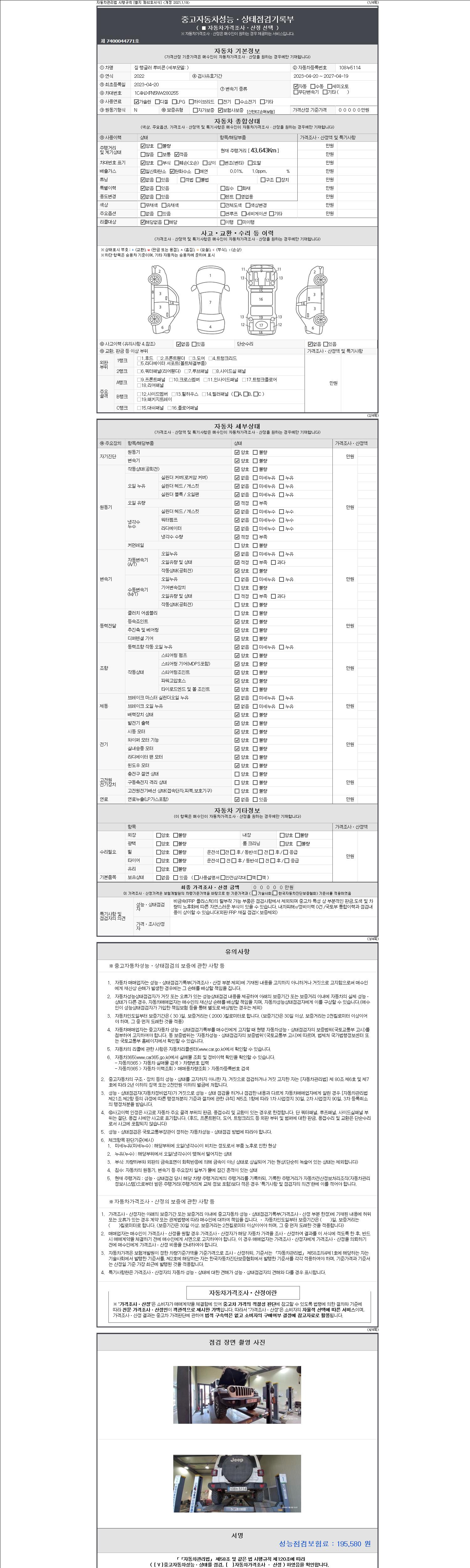 자동차관리법 시행규칙 제120조의 규정에 따라 별지 제 82호서식 《중고자동차 성능, 상태점검 기록부》를 발행한 성능, 상태점검자 및 매매자는 아래의 보증기간 또는 보증거리 이내의 중고자동차, 성능점검 기록부에 기재된 내용과 자동차의 실제 성능, 상태가 다른 경우 계약 또는 관계법령에 따라 매수인에 대하여 책임을 집니다.