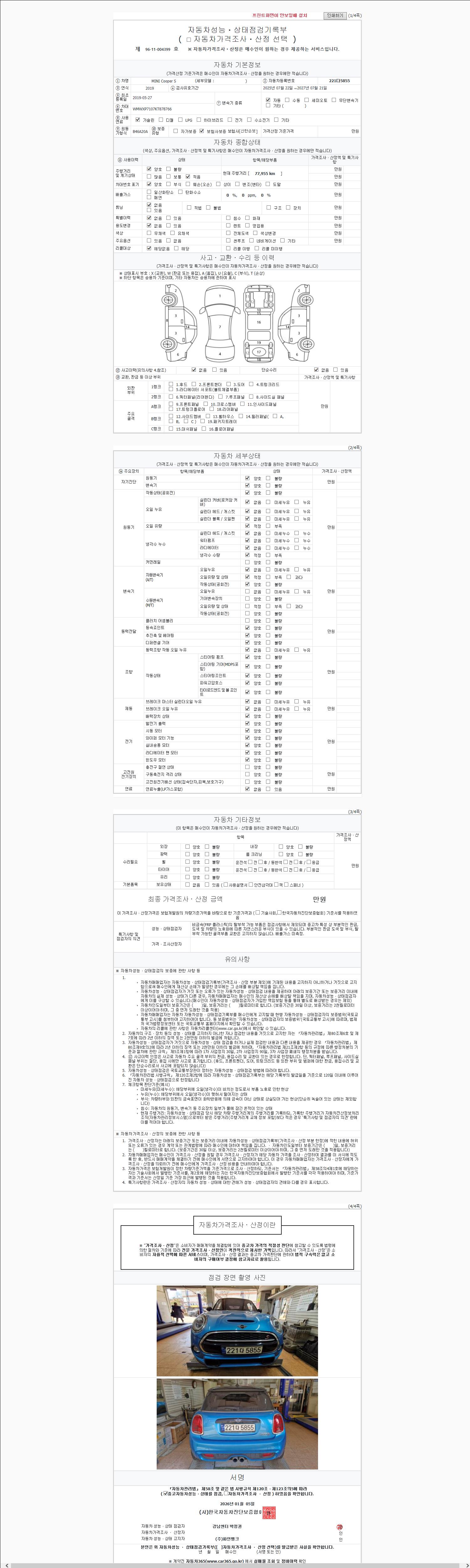 -중고자동차 매매업자를 통해 차량을 구입하실 경우 반드시 "중고자동차 성능, 상태점검 기록부"를 교뷰 받으셔야 하며, 매매업자는 반드시 의무 교부 하여야 압니다.