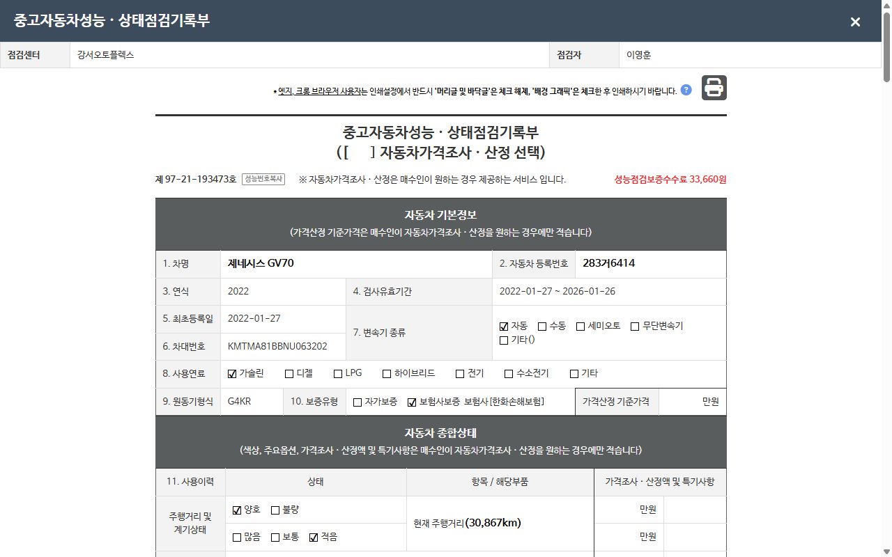 2. 차량 등록증이나 성능점검지 등을 상담자에게 요청및 확인하시고 사전에 미리 점검 하시기를 권유드립니다.