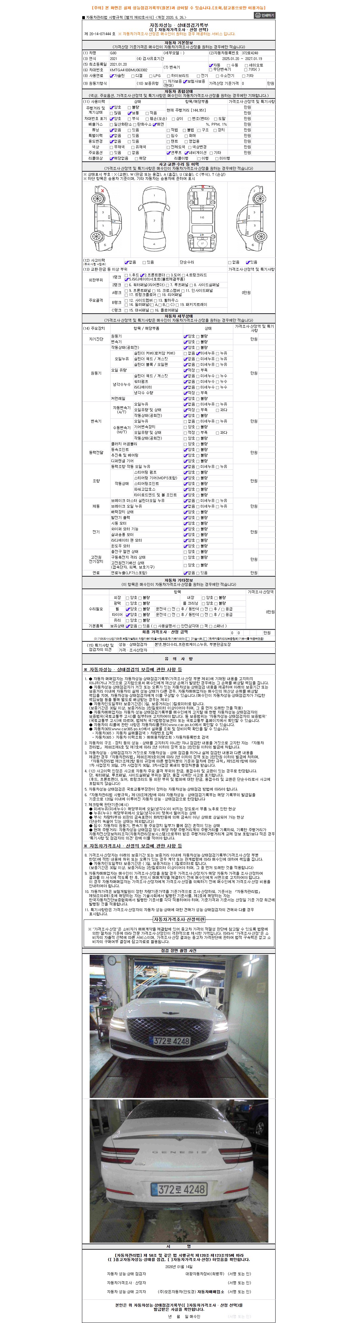 -중고자동차 매매업자를 통해 차량을 구입하실 경우 반드시 "중고자동차 성능, 상태점검 기록부"를 교뷰 받으셔야 하며, 매매업자는 반드시 의무 교부 하여야 압니다.