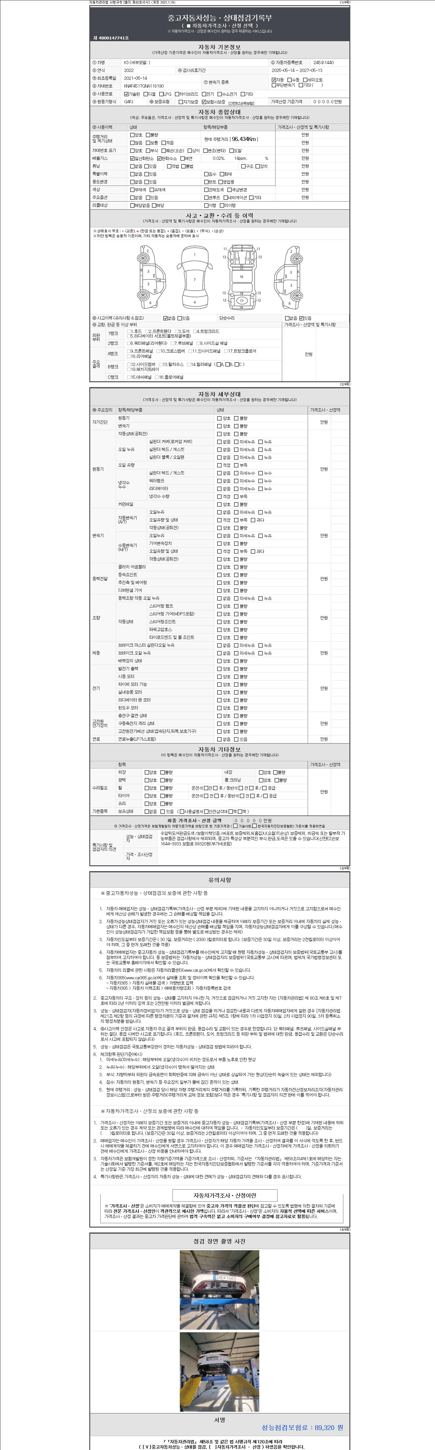 자동차관리법 시행규칙 제120조의 규정에 따라 별지 제 82호서식 《중고자동차 성능, 상태점검 기록부》를 발행한 성능, 상태점검자 및 매매자는 아래의 보증기간 또는 보증거리 이내의 중고자동차, 성능점검 기록부에 기재된 내용과 자동차의 실제 성능, 상태가 다른 경우 계약 또는 관계법령에 따라 매수인에 대하여 책임을 집니다.