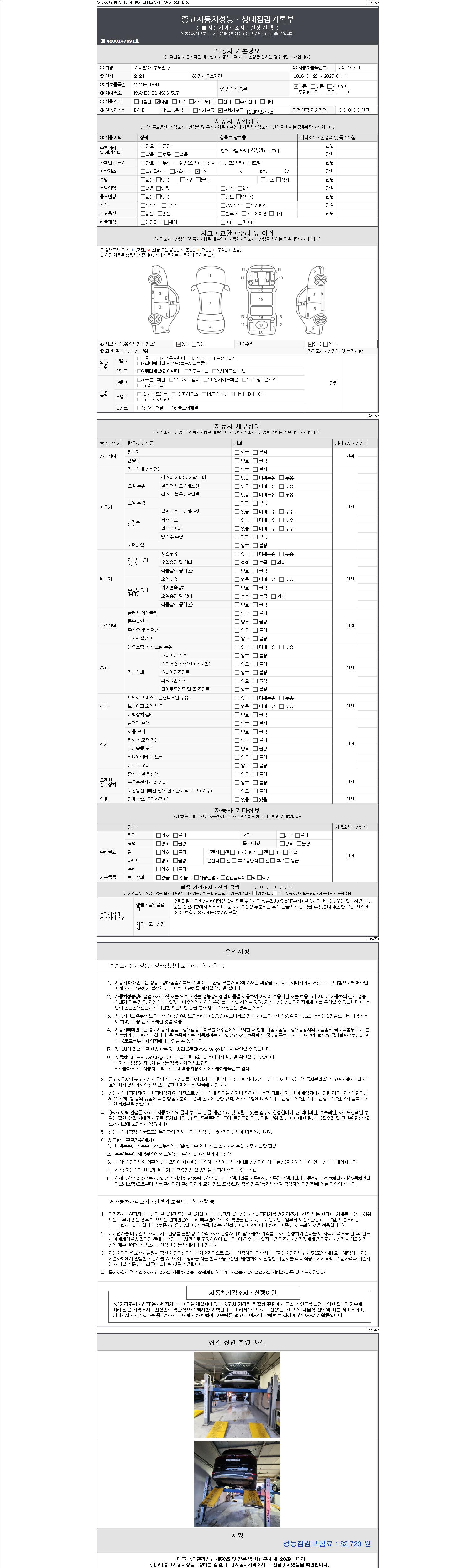자동차관리법 시행규칙 제120조의 규정에 따라 별지 제 82호서식 《중고자동차 성능, 상태점검 기록부》를 발행한 성능, 상태점검자 및 매매자는 아래의 보증기간 또는 보증거리 이내의 중고자동차, 성능점검 기록부에 기재된 내용과 자동차의 실제 성능, 상태가 다른 경우 계약 또는 관계법령에 따라 매수인에 대하여 책임을 집니다.