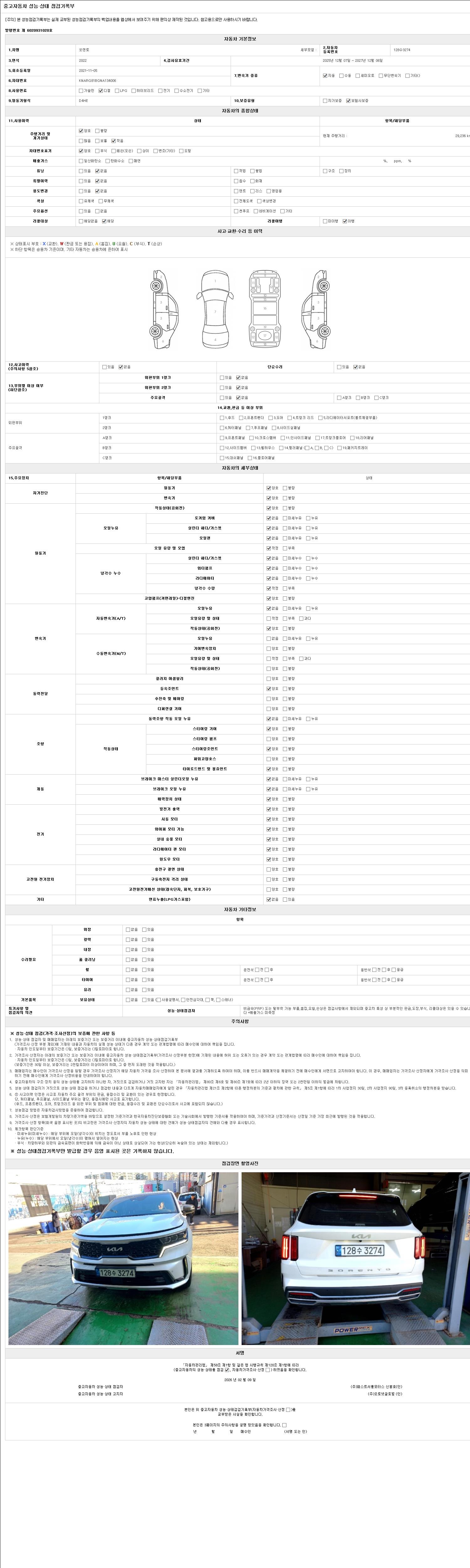 자동차관리법 시행규칙 제120조의 규정에 따라 별지 제 82호서식 《중고자동차 성능, 상태점검 기록부》를 발행한 성능, 상태점검자 및 매매자는 아래의 보증기간 또는 보증거리 이내의 중고자동차, 성능점검 기록부에 기재된 내용과 자동차의 실제 성능, 상태가 다른 경우 계약 또는 관계법령에 따라 매수인에 대하여 책임을 집니다.
