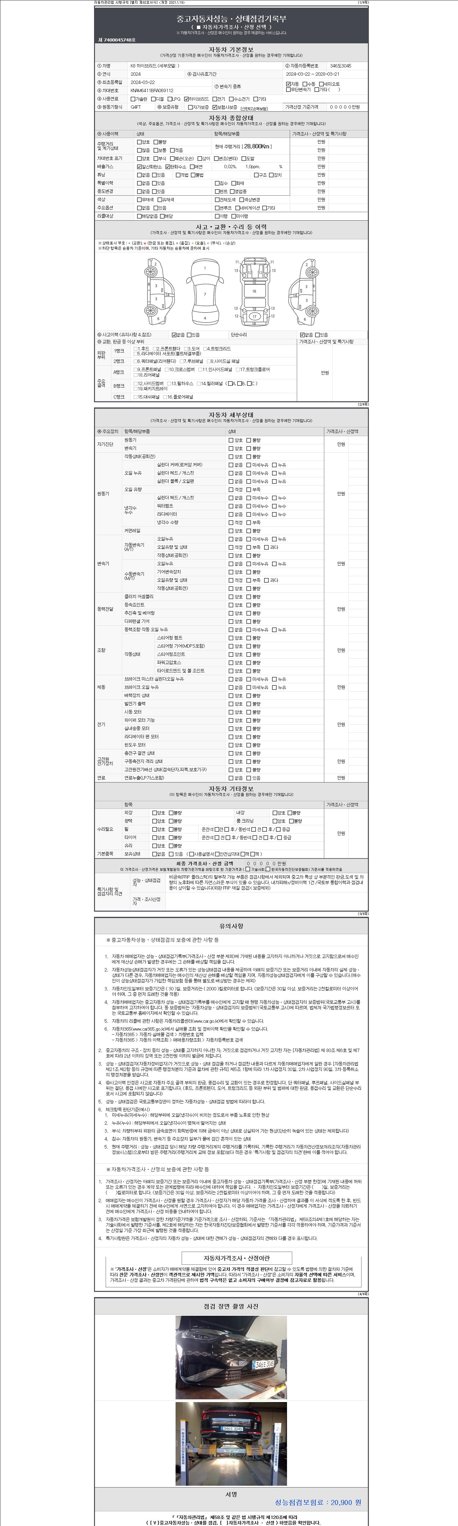 자동차관리법 시행규칙 제120조의 규정에 따라 별지 제 82호서식 《중고자동차 성능, 상태점검 기록부》를 발행한 성능, 상태점검자 및 매매자는 아래의 보증기간 또는 보증거리 이내의 중고자동차, 성능점검 기록부에 기재된 내용과 자동차의 실제 성능, 상태가 다른 경우 계약 또는 관계법령에 따라 매수인에 대하여 책임을 집니다.
