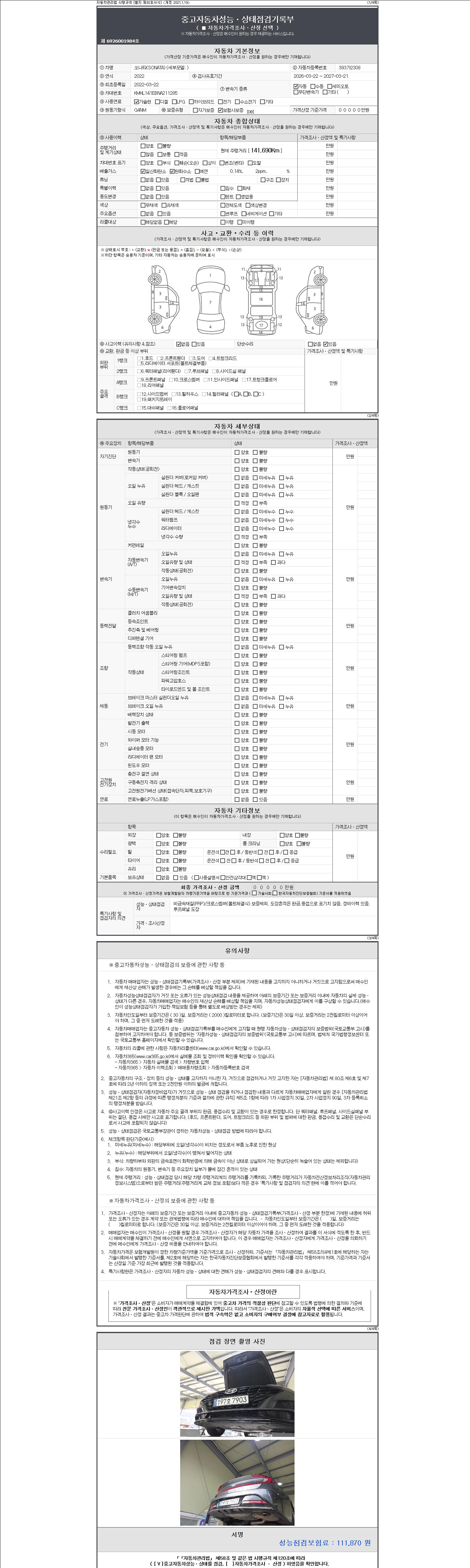 자동차관리법 시행규칙 제120조의 규정에 따라 별지 제 82호서식 《중고자동차 성능, 상태점검 기록부》를 발행한 성능, 상태점검자 및 매매자는 아래의 보증기간 또는 보증거리 이내의 중고자동차, 성능점검 기록부에 기재된 내용과 자동차의 실제 성능, 상태가 다른 경우 계약 또는 관계법령에 따라 매수인에 대하여 책임을 집니다.
